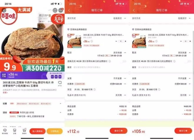 虽然标着参考价是9.9元,但是想要买到这个9.9元,需要购买11袋A款商品。而且在不断加入购物车的过程中,消费者基于把优惠券“用好用满”,“越买越便宜”的想法,不自觉地会提高购买量,毕竟年货“多囤一点”也没问题。这样一来,出货量就上去了。