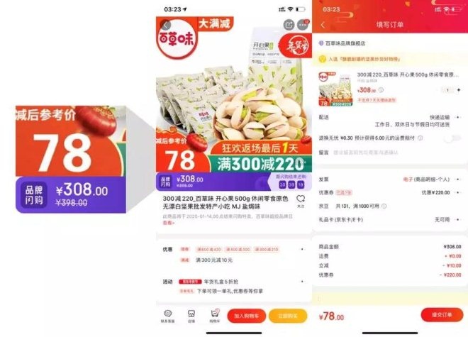 通过品牌闪购、满减、优惠券一顿操作下来,398元的商品,到手价是78元,相当于打了1.9折,让你79元买到了398元的开心果,你觉得赚大了,百草味亏惨了。