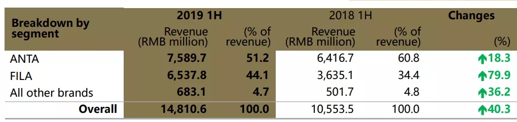 2019年上半年,安踏体育的业绩情况。数据来源:安踏体育2019年中期业绩公告