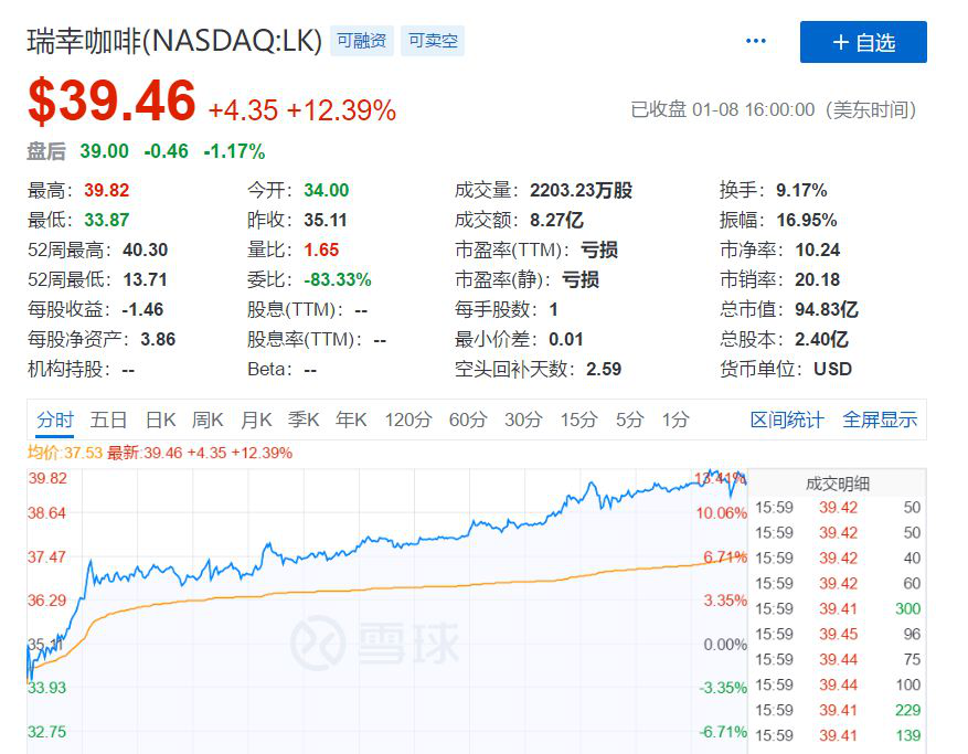一顿操作下来,当天收盘瑞幸咖啡股价涨12.39%,总市值达到98.43亿美元。