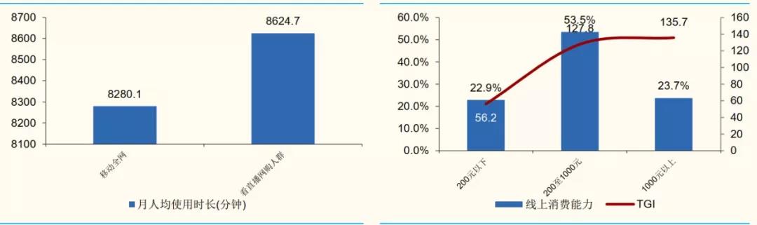 从年龄结构来看,抖音和快手25至35岁人群占比分别为47.7%和48.1%,我们推测观看抖音直播和快手直播的用户年龄结构与App用户属性相比,25至35岁人群的占比可能还会稍高一些,这类人群购买意愿充足且购买力较高,对于直播带货的贡献相对较大。根据2019年淘榜单联合淘宝直播发布的《天猫618淘宝直播消费者画像》,90后成为直播间的消费主力,00后异军突起,同样具有很强购买力。网红直播带货是新兴的购物模式,那么95后、00后正是成长于网红直播带货的高速发展期,是正在被培育的一代,已经初步展现出一定的消费潜能以及未来购物渠道的迁移偏好。
