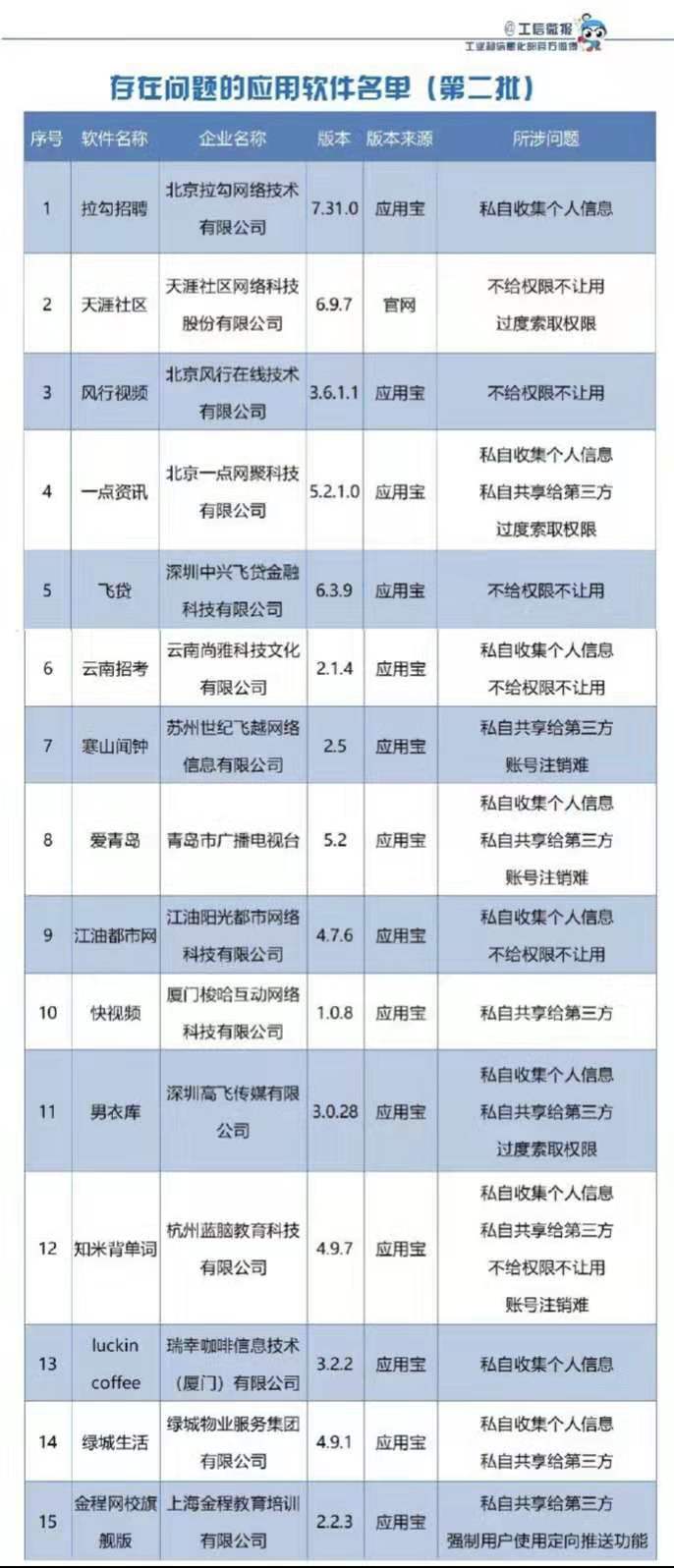 1月8日消息,工信部通报第二批侵害用户权益行为APP,15款产品在列,包括拉勾招聘等。