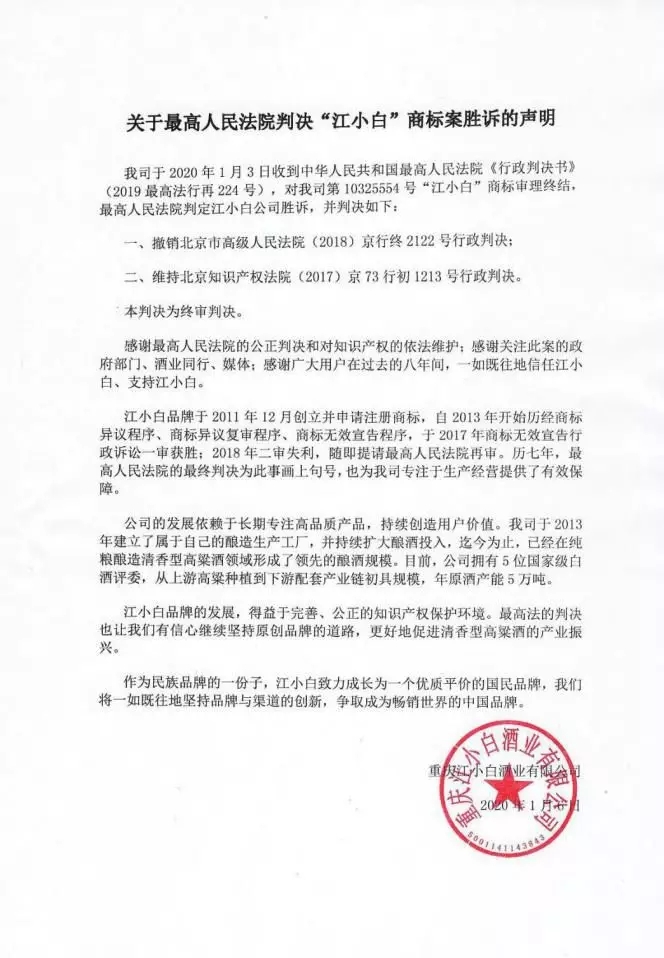 2018年11月22起,“江小白”商标被宣告无效,江小白公司裸奔400天后,于2019年12月26日,终于拿到“亲子鉴定”结果:“江小白”商标属于江小白公司。