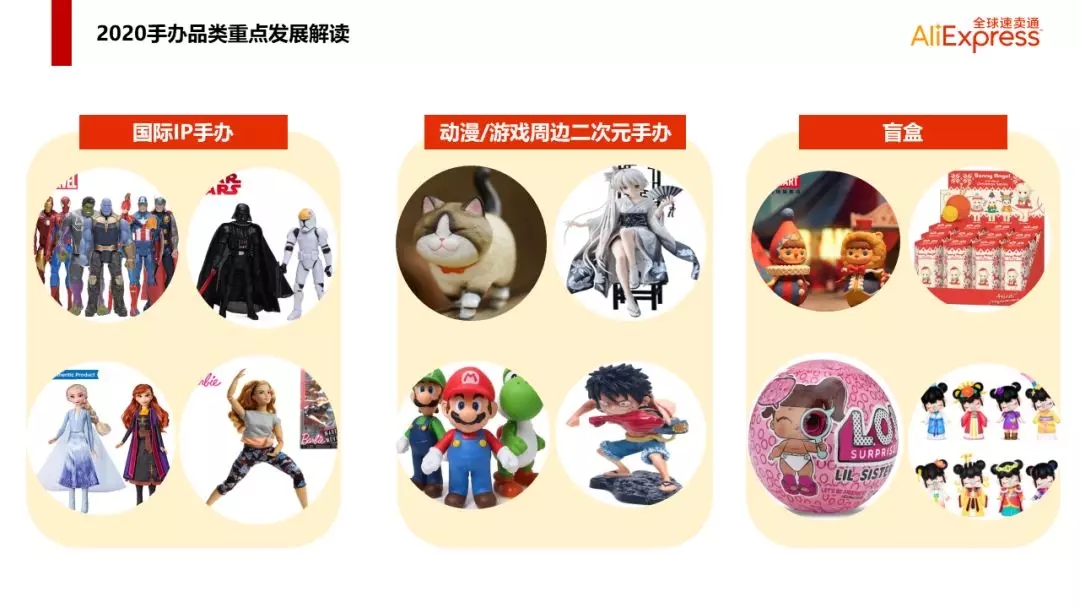 手办品类2020年重点发展3大方向:① 国际知名IP,②动漫/游戏周边,③二次元手办,④盲盒,⑤变形金刚/机器人(高达类)。其中国际知名IP指:迪士尼旗下IP(星战/漫威/冰雪奇缘/玩具总动员等);孩之宝旗下IP(小马宝莉/变形金刚等);美泰旗下IP(风火轮/芭比等)。
