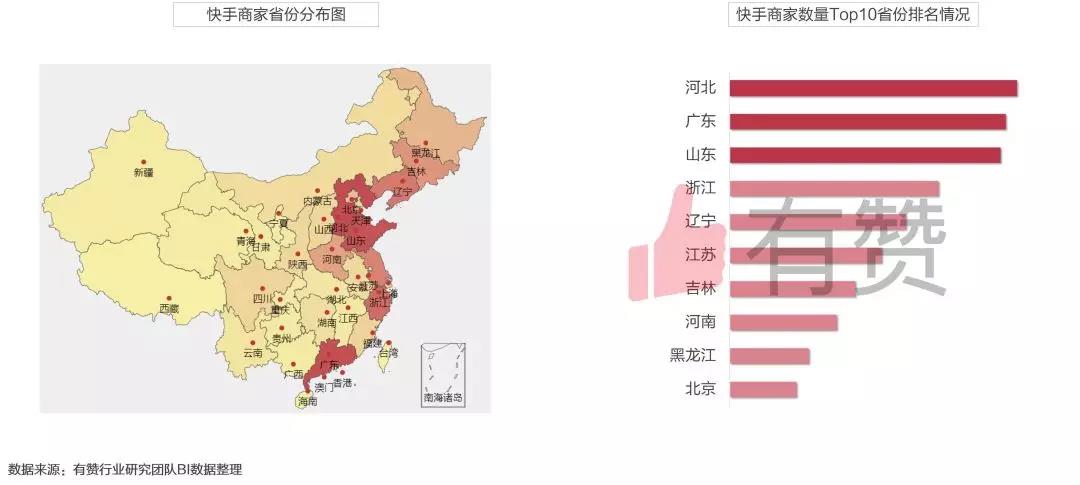 有赞快手商家在河北、山东和广东地区分布最广。在商家数量Top10省份中,河北、广东和山东表现最突出。