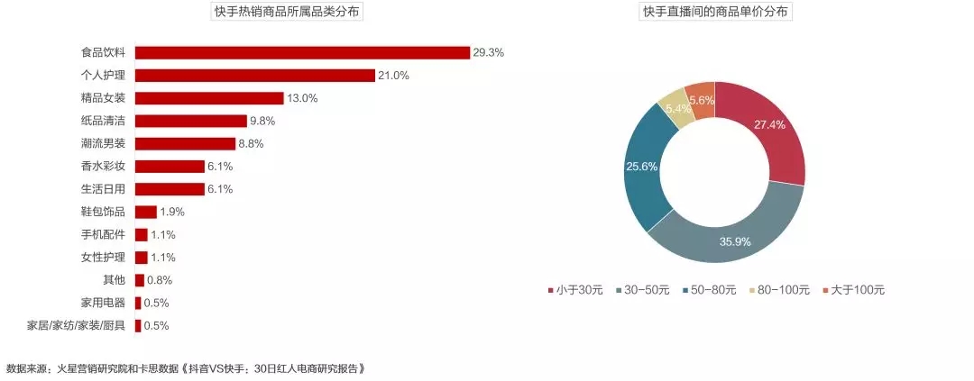 从热销商品品类来看,食品、个护和女装占快手总销量的6成以上,其中个护品类中以面膜为主。从带货强V直播间的商品单价上看,粉丝们购买30-50元的商品占比最多。