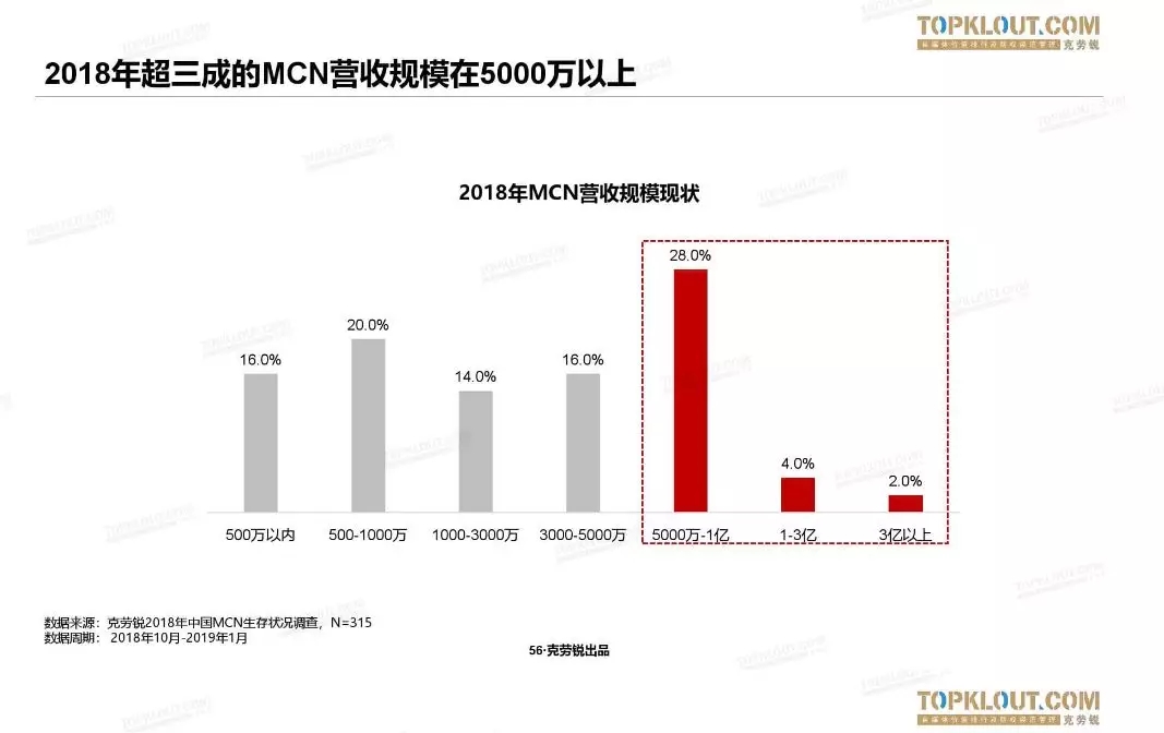 据克劳锐报告显示,2018年有34%的MCN营收超过5000万元,其中6%的MCN年营收超1亿元;在变现方式上,超八成的MCN都有广告营销业务,35.5%的MCN则开辟了内容电商业务。