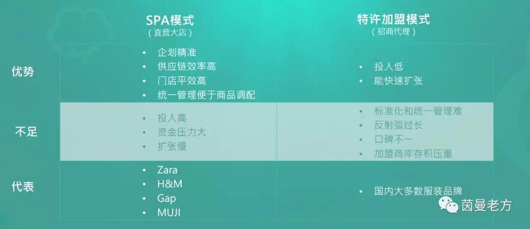 茵曼2015年开始布局线下,当时正值国内传统服装品牌大规模关店潮,对于陌生的线下市场,摆在茵曼面前的第一个问题是门店的运营模式如何选择。在线下,品牌服装企业主要采用两种经营模式,即自有品牌专业零售模式(SPA)和特许加盟模式(Franchising),二者分别代表着重资产经营和轻资产经营的方向。