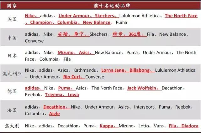 2018年各国前十名运动品牌,没有贵人鸟,图/中金公司