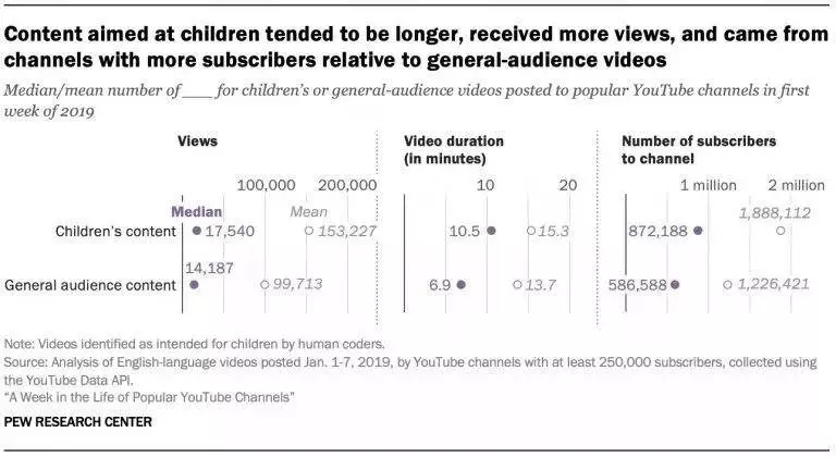 美国皮尤研究中心在此前的报告中显示,在粉丝数量比较多的频道中,与儿童相关的YouTube视频平均观看次数是其他类型视频的3倍;同时他们也调查了育有11岁以下儿童的父母,发现81%的孩子被允许观看YouTube。