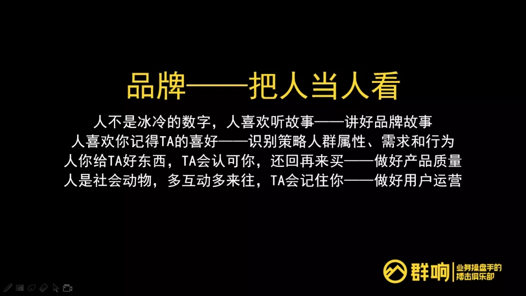 一要讲好品牌故事,大家不是冰冷的数字,是人,人喜欢听故事;二要识别策略人群属性、需求和行为,投其TA的所好;三做好产品质量,对好对应的匹配,给他喜好的东西得到认可;四做好用户运营。