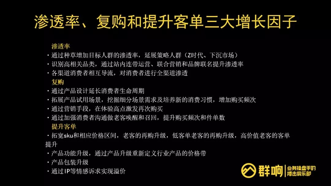 最终反映到数字上,就是GMV,实际上对应的就是渗透率、复购和提升客单,三大增长因子。