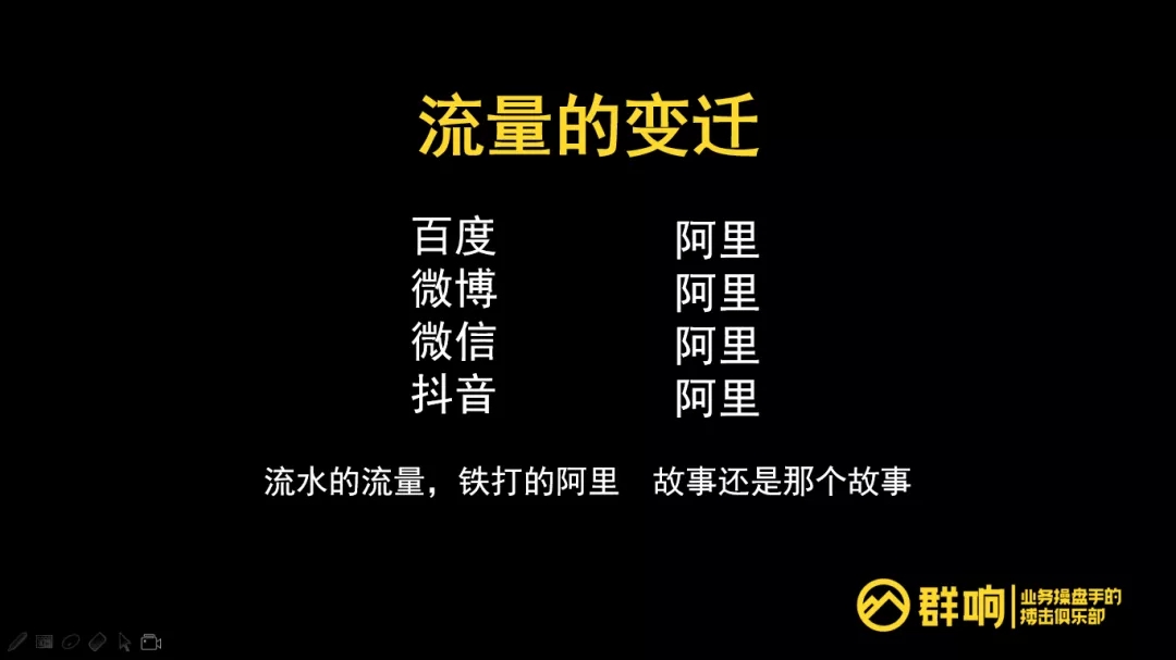从百度到微博,再到微信,然后到抖音,整个的成交端始终都是阿里阿里阿里阿里。