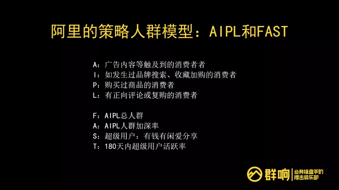 阿里对消费者的运营精细化,对应FAST模型,F,就是AIPL总人群。AIPL人群加深率,从A到I是加深,I到P也是加深,P到L也是加深,你有兴趣的人对你产生购买,购买的人产生复购,这都是关系的加深。