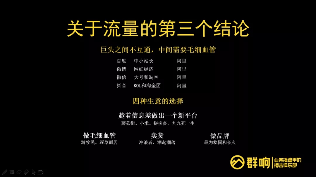 第一种生意选择是趁着信息差做出一个新的平台;第二种是做毛细血管,随着流量平台不断迁徙;第三种是卖货,跟着流量平台潮起潮落;最后一种做品牌,品牌是消费者心中的心智,最为稳固和长久。