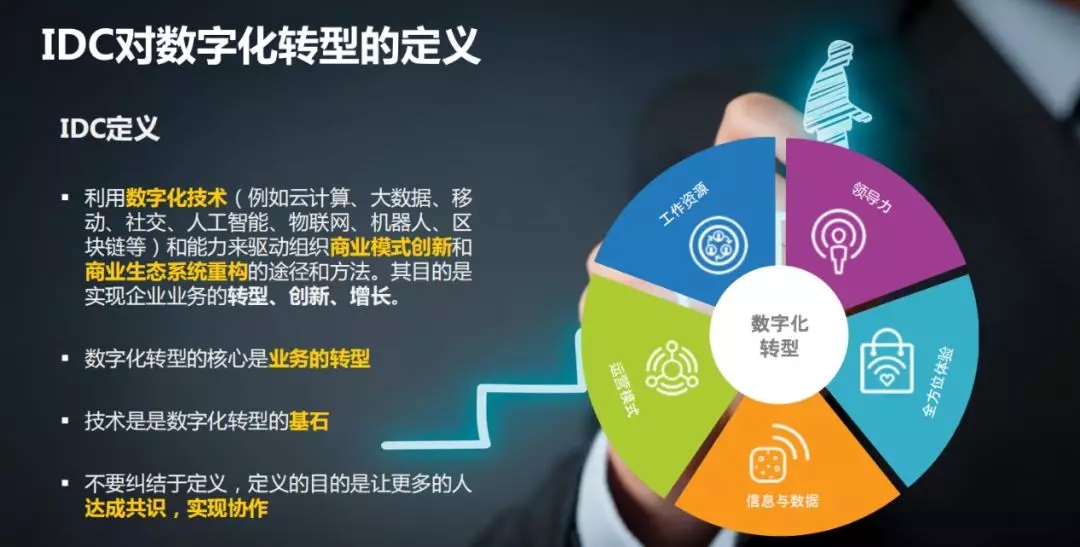 首先我给大家分享了数字化转型的概念和本质,IDC把数字化转型分成五个大的方面。