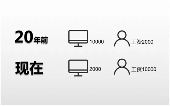 20年过去了,现在一台电脑只需两三千元,一个云服务器不过百元,各种新科技、黑科技层出不穷,实惠且好用;而这时,一个员工的工资、社保成本等却飞升到了万元以上。