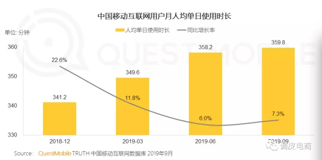 其次,已经在网上的这些存量用户,触网的时间也见顶了。今年9月,单日人均使用时长359.8分钟,仅比6月的时长增加了1.6分钟。