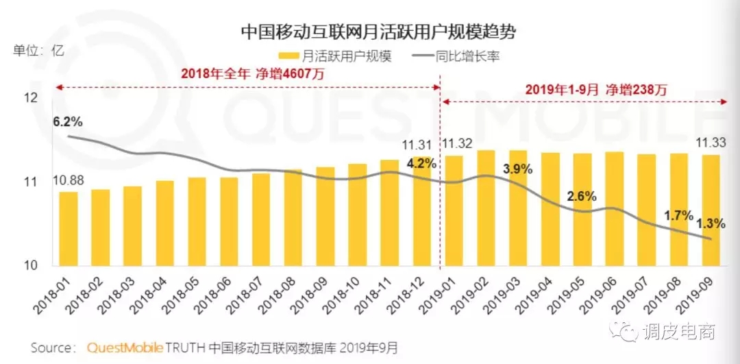首先,新用户已经见顶了,2018年全年,中国移动互联网用户净增4607万,到了2019年,1-9月三个季度,新增用户锐减到238万。