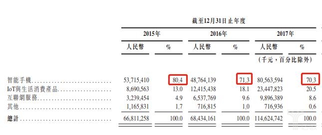 同样值得关注的,还有小米智能手机在整体营收占比中的降低。