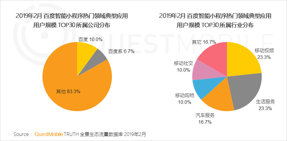 报告指出,百度小程序更加开放,成立开源联盟寄望服务于更广泛的互联网玩家,目前用户规模TOP30的百度小程序中,行业主要集中在移动视频、生活服务和汽车服务等领域,非百度系占比高达83.3%。