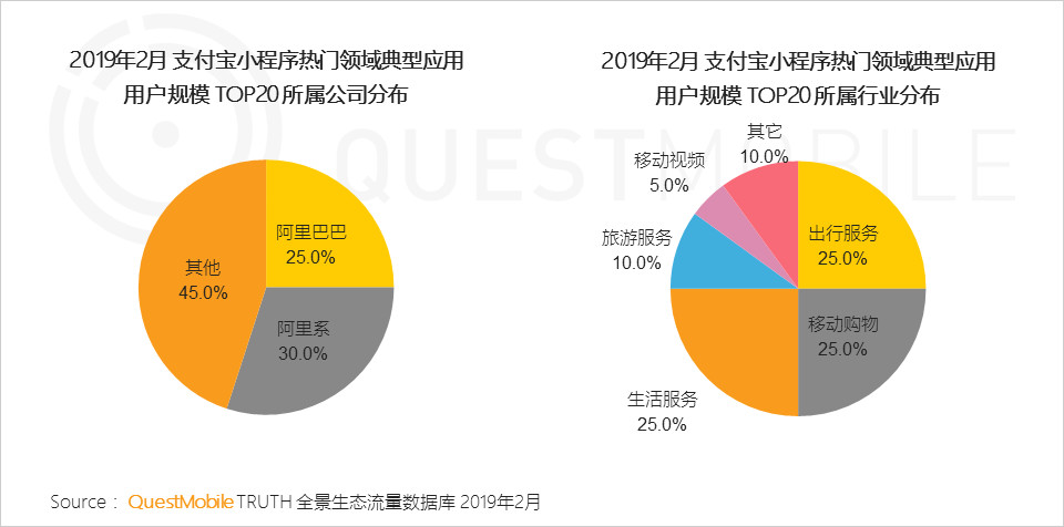 QuestMobile指出,支付宝小程序倚靠阿里强大的商业能力,对集团旗下多业务进行跨场景用户拓展,目前平台应用所属行业更多集中在旅游出行、电商及生活服务。