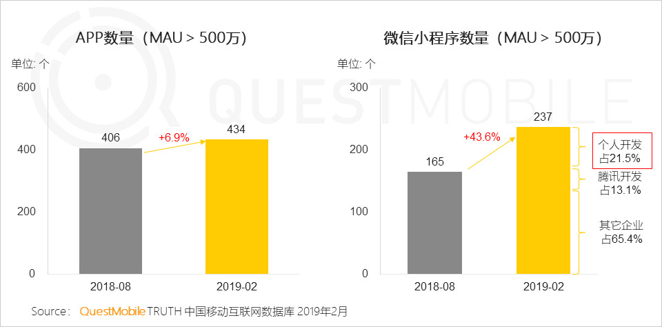 数据显示,微信小程序中,500万以上规模的数量半年来达到237个,其中个人开发者占比高达2成。