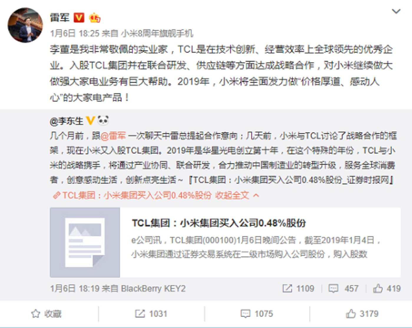 昨日,TCL集团发布公告。公告显示,小米集团在1月4日通过深交所在二级市场购入TCL公司的65168803股,以占总股本的0.48%的资金入股TCL集团。对此,TCL董事长李东生和小米CEO雷军均在微博上予以证实。