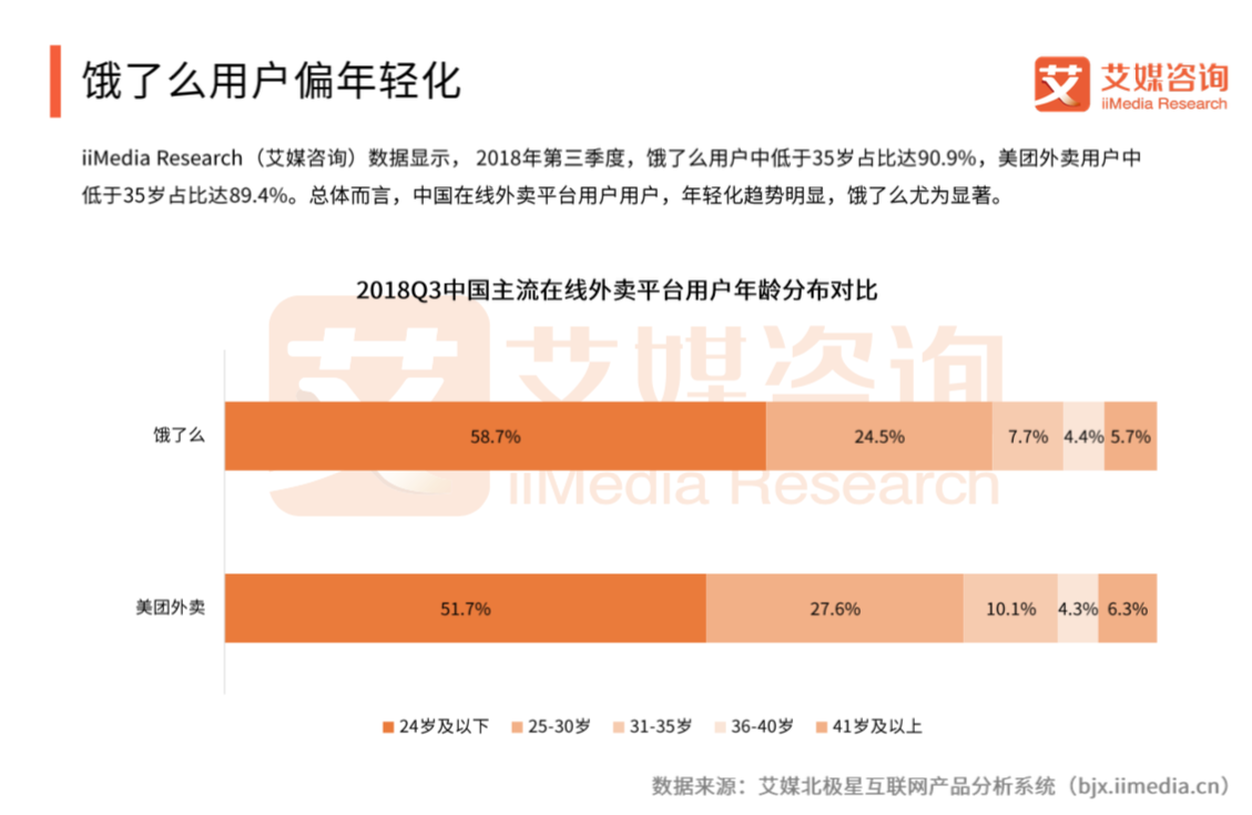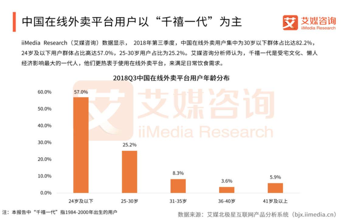 报告分析认为,千禧一代是受宅文化、懒人经济影响最大的一代人,他们更热衷于使用在线外卖平台来满足日常饮食需求,中国在线外卖平台的用户也以千禧一代为主。其中,又以24岁及以下的95后为主力,该人群数量占比接近六成。