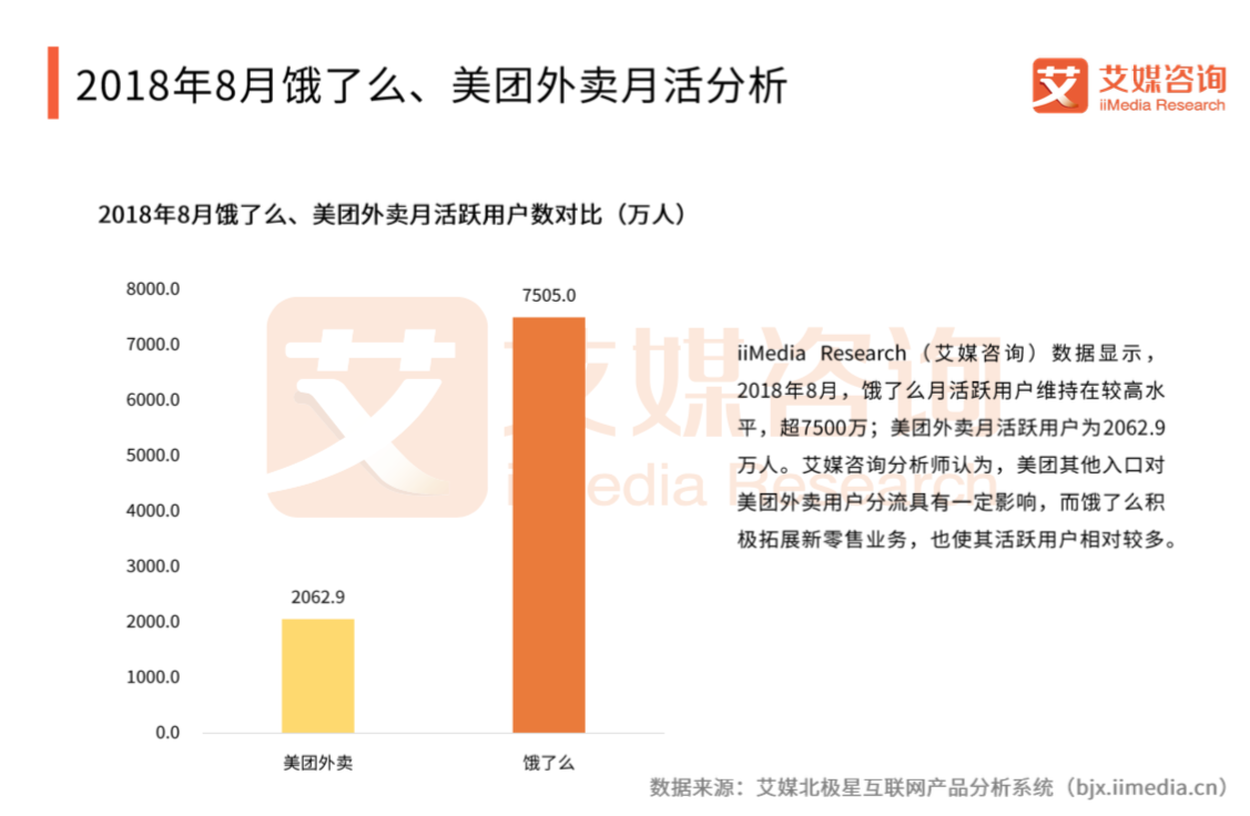 艾媒咨询监测的数据显示,受益于积极拓展的新零售业务,饿了么2018年8月的月活跃用户数超7500万人。