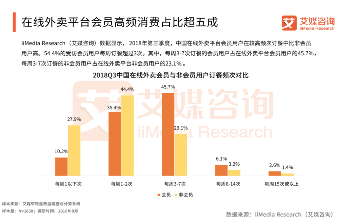 报告数据还显示,2018年第三季度,中国在线外卖平台会员用户在较高频次订餐中的占比显著高于非会员,其中,54.4%的受访会员每周订餐超过3次,该比例在非会员中不到三成。