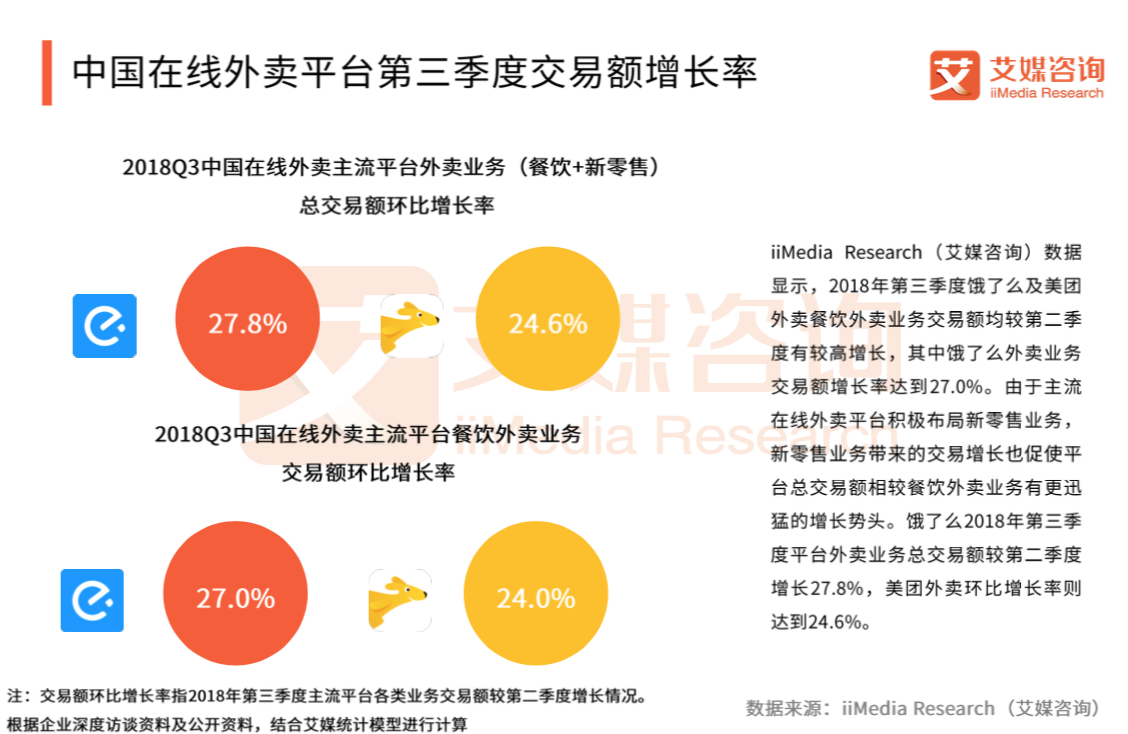 报告公布的监测数据显示,2018年Q3饿了么外卖业务交易额增长率达27.0%,美团外卖业务交易额增长率达24.0%。
