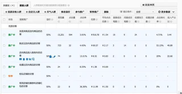 第二步,把优质的人群充分利用起来,自己店铺或者同类店铺,这样流量相对精准些。点击率客观。但是PPC偏高。要求有一定的店铺基础。搜索人群前提对拉升点击率非常有必要,我们溢价可以从100%开始,类目不同有的高有的低。