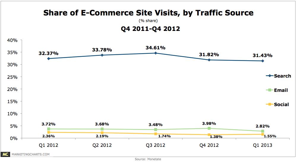 根据电子商务技术公司Monetate最近发布的《2013年Q1美国电子商务报告》,同email(2.82%)和社交网站(1.55%)相比,搜索引擎(31.43%)是电商网站最直接和最主要的流量来源。这样的情形已不是一天两天了,在未来的很长一段时间也可能都是这样。跟去年一季度相比,由email和社交网站带来的电商流量比例已有所下降。但调查人员根据最近的研究提出了一个观点:以上的调查结果是建立在最后接触的归因模型上的,它通常都低估了社交网站的作用。