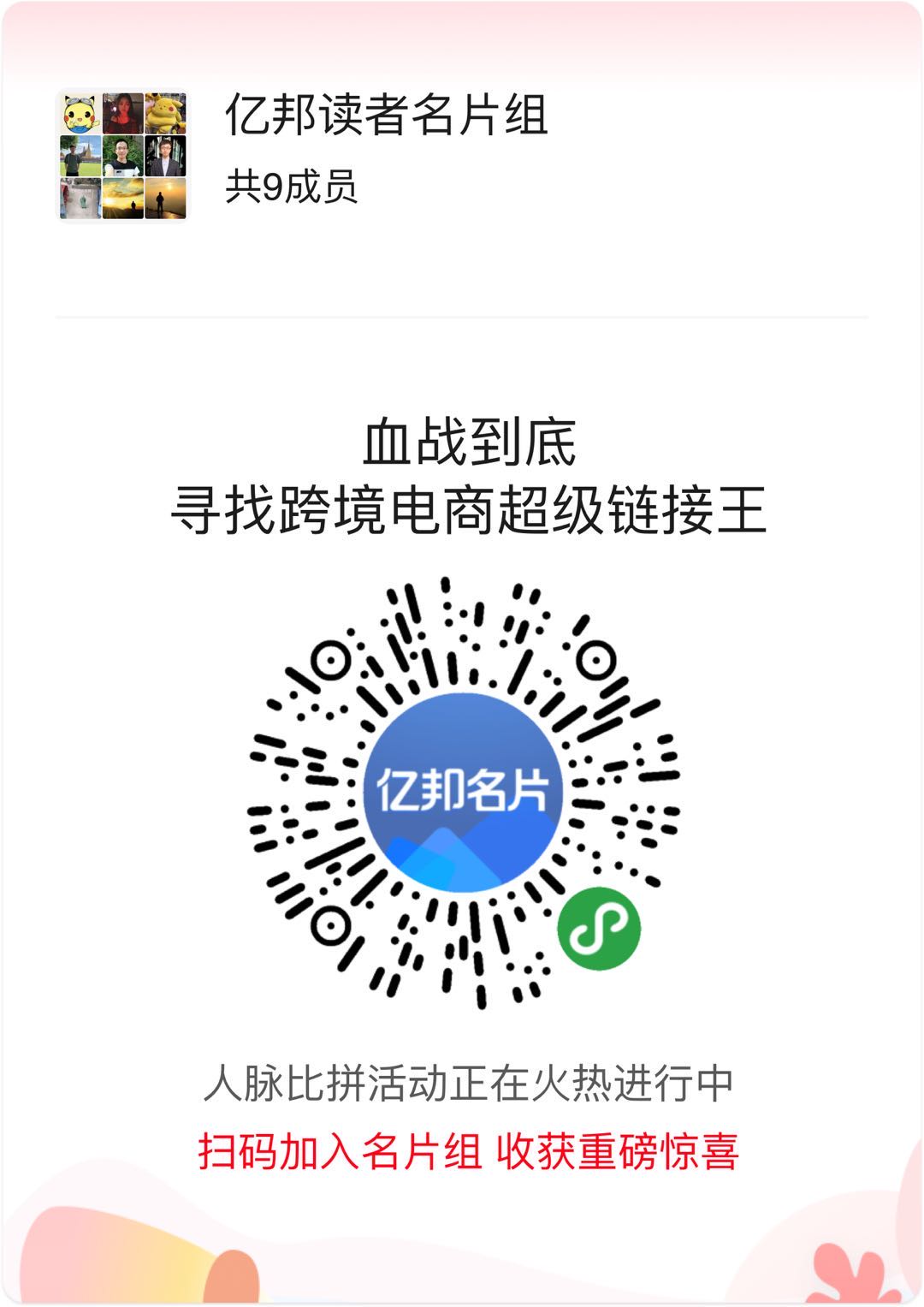 我们创建了亿邦读者名片组,扫码加入吧,寻找自己需要的人脉资源