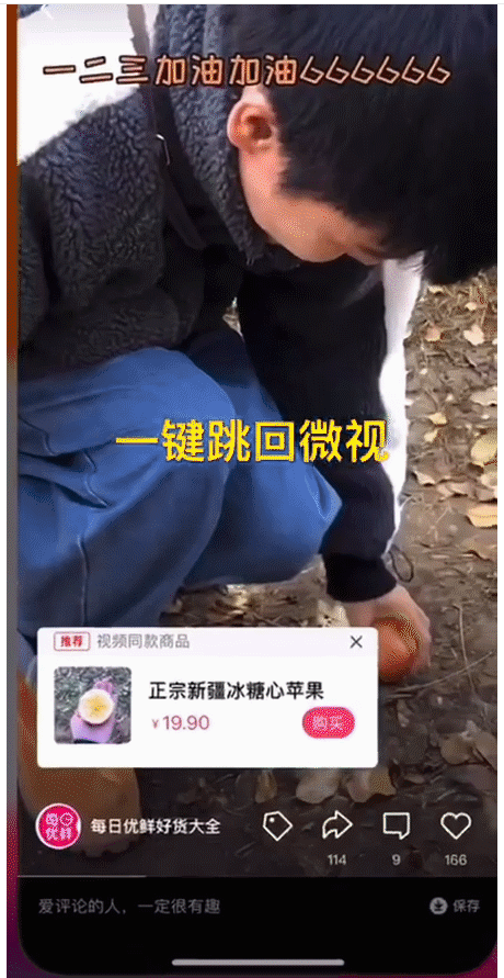 比较有意思的是,用户从微视跳转到小程序后,小程序页面上有一个按钮,可以一键返回微视。如此,微视和微信小程序可以形成完整的服务闭环:用户看内容→跳转小程序购买→回头微视看其他内容。