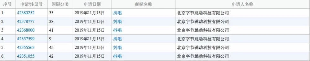 12月3日消息,据中国商标网显示,11月15日,北京字节跳动科技有限公司申请“抖唱”商标注册,申请类别分别为35类、38类、41类、9类、45类、42类。