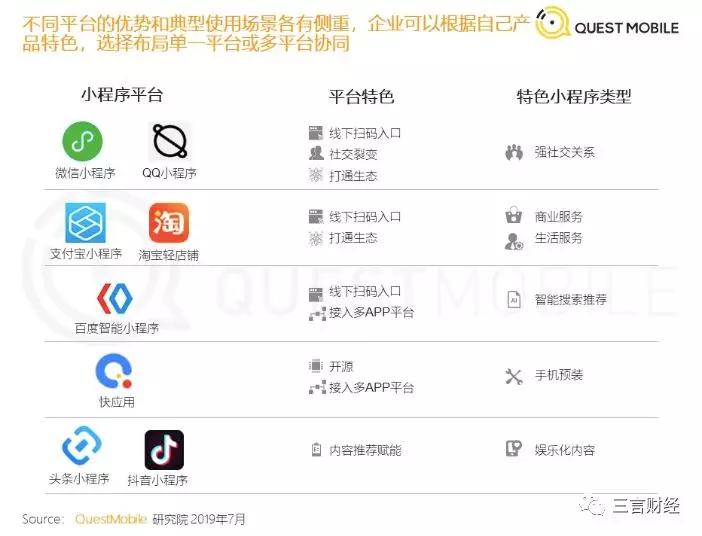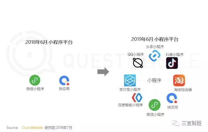 QuestMobile数据显示,截止到2019年6月,已经有8家平台推出了小程序,腾讯系的微信、QQ,阿里系的支付宝、淘宝轻店铺,百度的智能小程序、头条系的头条、抖音,以及手机厂商联合的快应用。