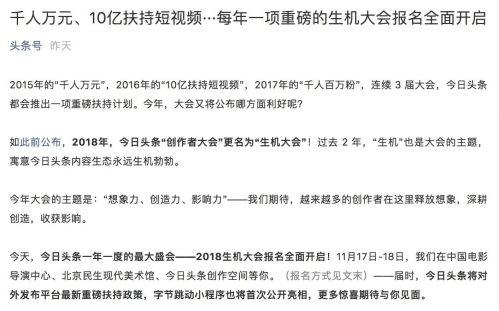根据头条号公告,在此次大会上,还会发布最新扶持政策。2016年,今日头条曾提出“10亿扶持短视频”,2017年提出了“千人百万粉”,今年的扶持投入相比也不会少。