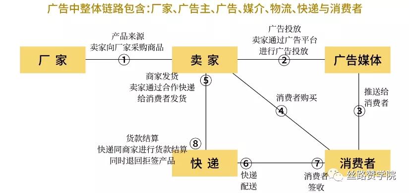 广告中整体链路包含了厂家,广告主、广告、媒介、物流、快递与消费者四个角色,共分为8个环节: