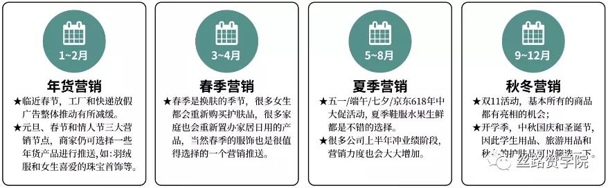 9~12月的秋冬营销:这个阶段有着全年电商人最疯狂的双11活动,基本所有的商品都有亮相的机会,而且这个阶段还有这开学季,中秋国庆和圣诞节,因此学生用品、旅游用品和秋冬的护肤品可以好好地筛选一下。
