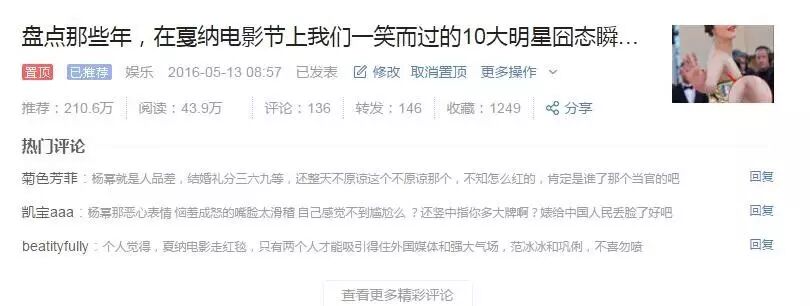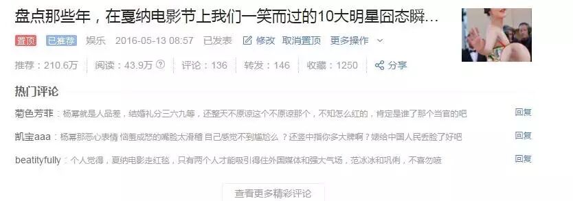 比如我这篇其实,在今日头条上有很多文章都是报道戛纳电影节上的美啊。刘亦菲啊,x妮啊,巩俐啊。如果是这样,一定要反方向想那我写一篇他们出丑的文章吧。你写的角度没有多少人写,自然是分分钟爆款的节奏啦!