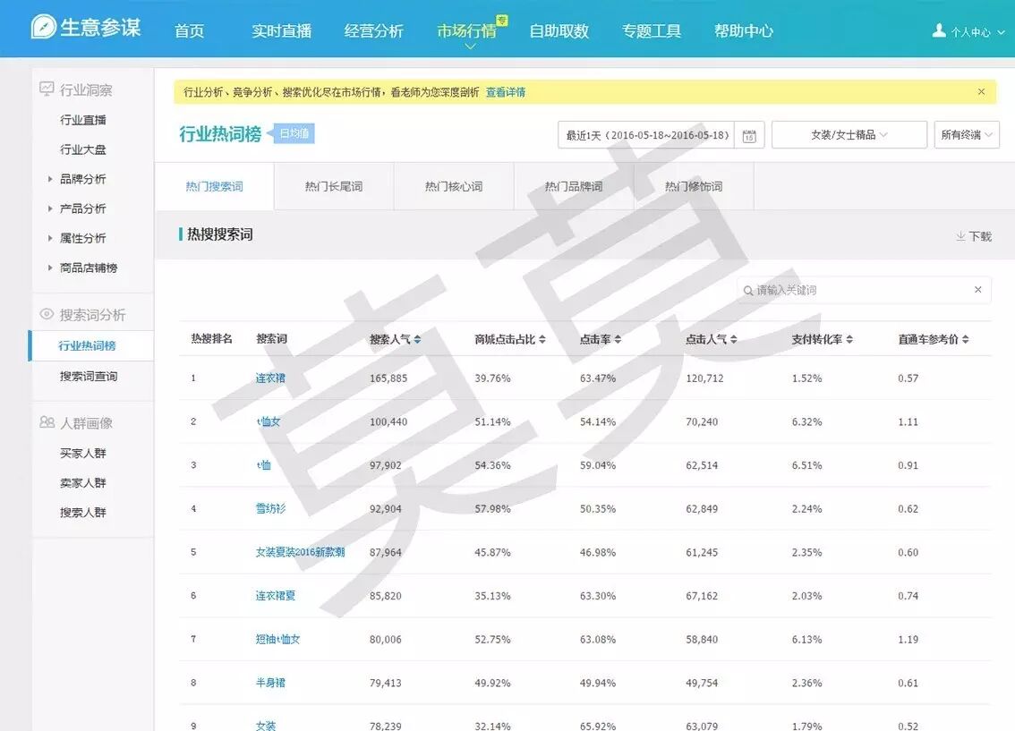 ? ? ? ?我们打开生意参谋,来开始做我们的词,睡着的别睡了,进入之后呢,点击市场行情,左边点击行业热词榜,选择你产品的类目,日期选择七天的数据,因为单天的数据可能不稳定。点击下载。