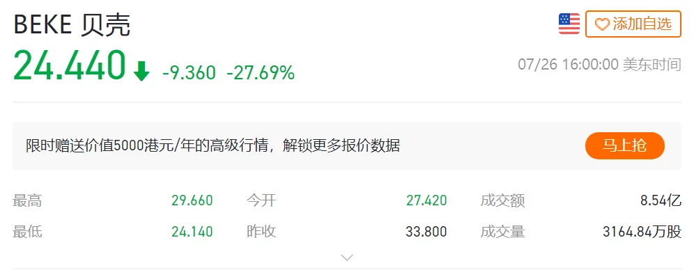 随后我们观察到,纽交所上市的贝壳股价下跌。这难道说明传闻要成真?