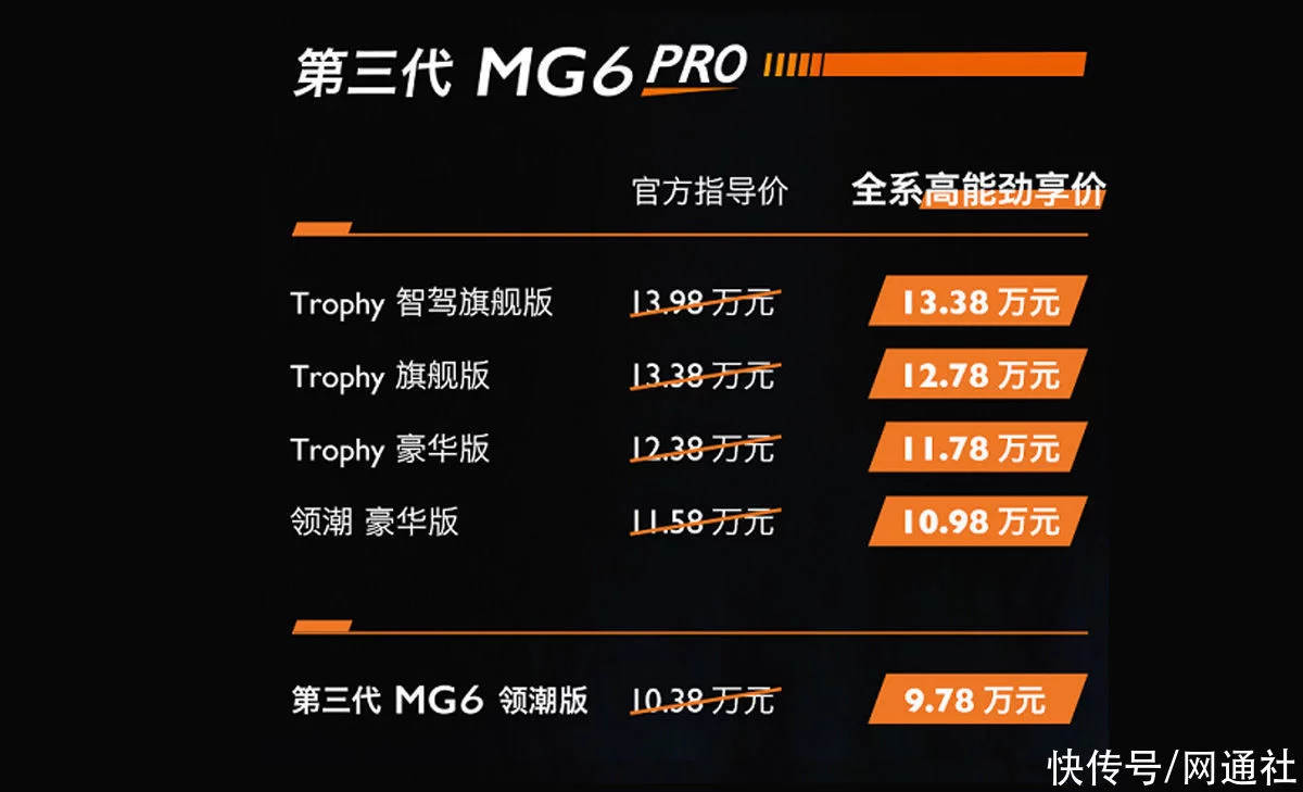 8月12日,网通社从上汽名爵官方获悉,第三代MG6 PRO正式上市,共推出五款车型,官方指导价为10.38万元-13.98万元,MG还推出了现金红包6000元,最终的上市高能劲享价为9.78万元-13.38万元。作为一款主打运动的车型,第三代MG6 PRO采用了运动轿跑设计,配合年轻的“气泡橙”等车身颜色以及大量空气动力学套件,呈现出跑车般动感气质。动力方面,新车搭载2.0 MEGA Tech全新一代动力系统,0-100km/h加速仅需7.83秒。