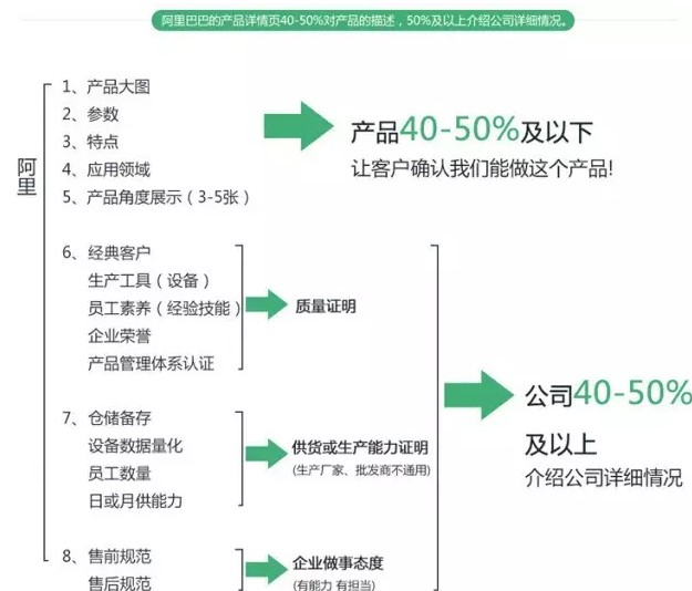 淘宝:包括产品大图、场景图、参数、对比VS图、角度图、品牌介绍等。 阿里巴巴:①、让客户需要知道是不是要找的产品:产品大图、参数(专业客户)、特点、应用领域(非专业客户),②、这个公司值不值得联系洽谈(因各企业情况不同仅供参考):质量过不过关(经典客户、精致设备、人员素养、企业荣誉、质量认证体系等),首先让客户放心做产品的基本条件;供货能力强不强(仓储、设备量、员工基数、阶段供货能力等),解决客户担心供不上货导致对方停产或打乱对方计划的问题;企业行事态度(售前服务、售后体系等),解决采购商对企业做事情的态度感受问题;销售政策(返点、合作政策等),这是针对招商加盟的企业,解决后续客户牢固合作问题;