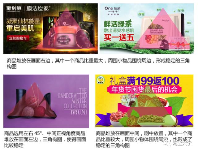 虽然都是堆放的形式去构图的,但是我们在实际做图的时候使可以多样化地去应用,前面几种三角堆放的形式在食品类、服饰鞋包或综合类目的活动的应用中较多,后面几种比较适合的同类产品的堆放,要求产品摆放形状都是比较有规律的立方体或扁平的产品。