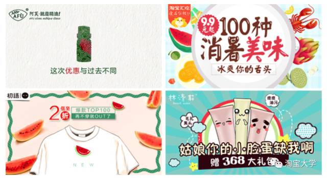 这种banner比较适合食品/零食类、偏可爱的服饰类,母婴类,因为这些关键词的属性跟这些品类的特点是一致的,要给消费者可爱、可口、甜美、极具亲和力的感觉。