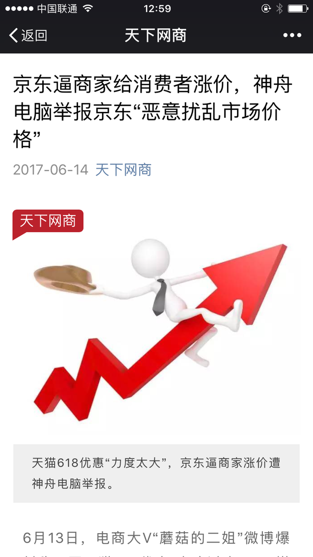 今天早些时间,天下网商在其微信公众号中推送《京东逼商家给消费者涨价,神舟电脑举报京东“恶意扰乱市场价格”》一文。在文章中,天下网商引用了ID为“蘑菇的二姐”的网友爆料,称因天猫618优惠“力度过大”,京东强行要求数码手机商家上调天猫旗舰店的价格。