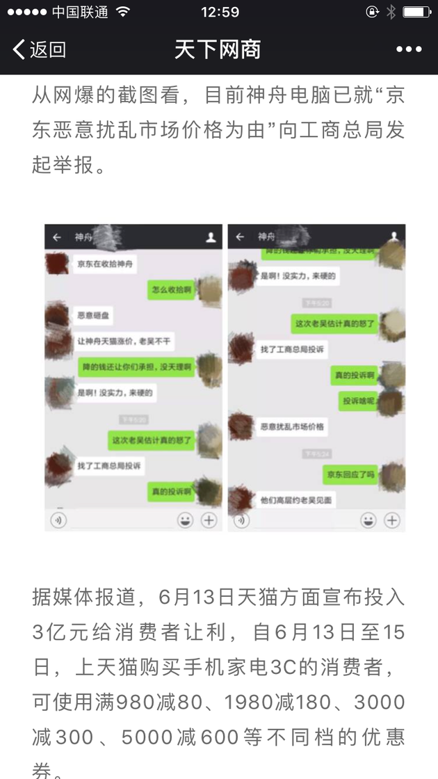 天下网商引用的曝料截图显示,由于当天神舟参加了天猫的满减活动,其天猫官方旗舰店笔记本电脑价格普遍低于京东,导致“被收拾”。在逼迫涨价遭到拒绝后,京东强行下调了神舟电脑在京东的价格,并提出降价成本由神舟方面承担。文章称,神舟电脑已就“京东恶意扰乱市场价格”为由向工商总局发起举报。